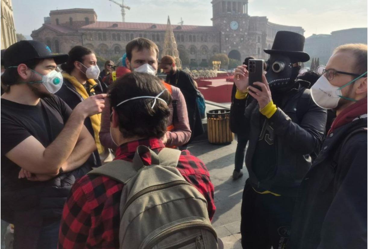 Активисты в респираторах и противогазах проводят акцию против загрязнения воздуха в Ереване