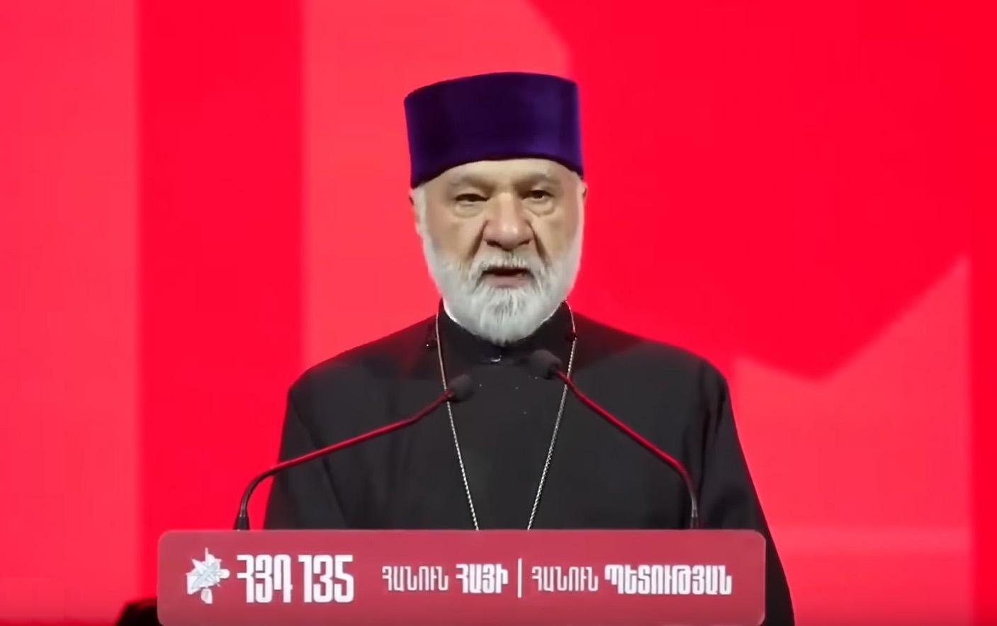 В этот момент я имею честь передать благословение и тёплые приветствия рукоположенного Патриарха моего народа, Его Святейшества Гарегина II, Католикоса всех армян, всем присутствующим на этой церемонии, посвящённой 135-летию Армянской Революционной Федерации, и всем тем, кто во всём мире с радостью, гордостью и истинной братской любовью отмечает этот юбилей и радуется вместе с нашим народом.