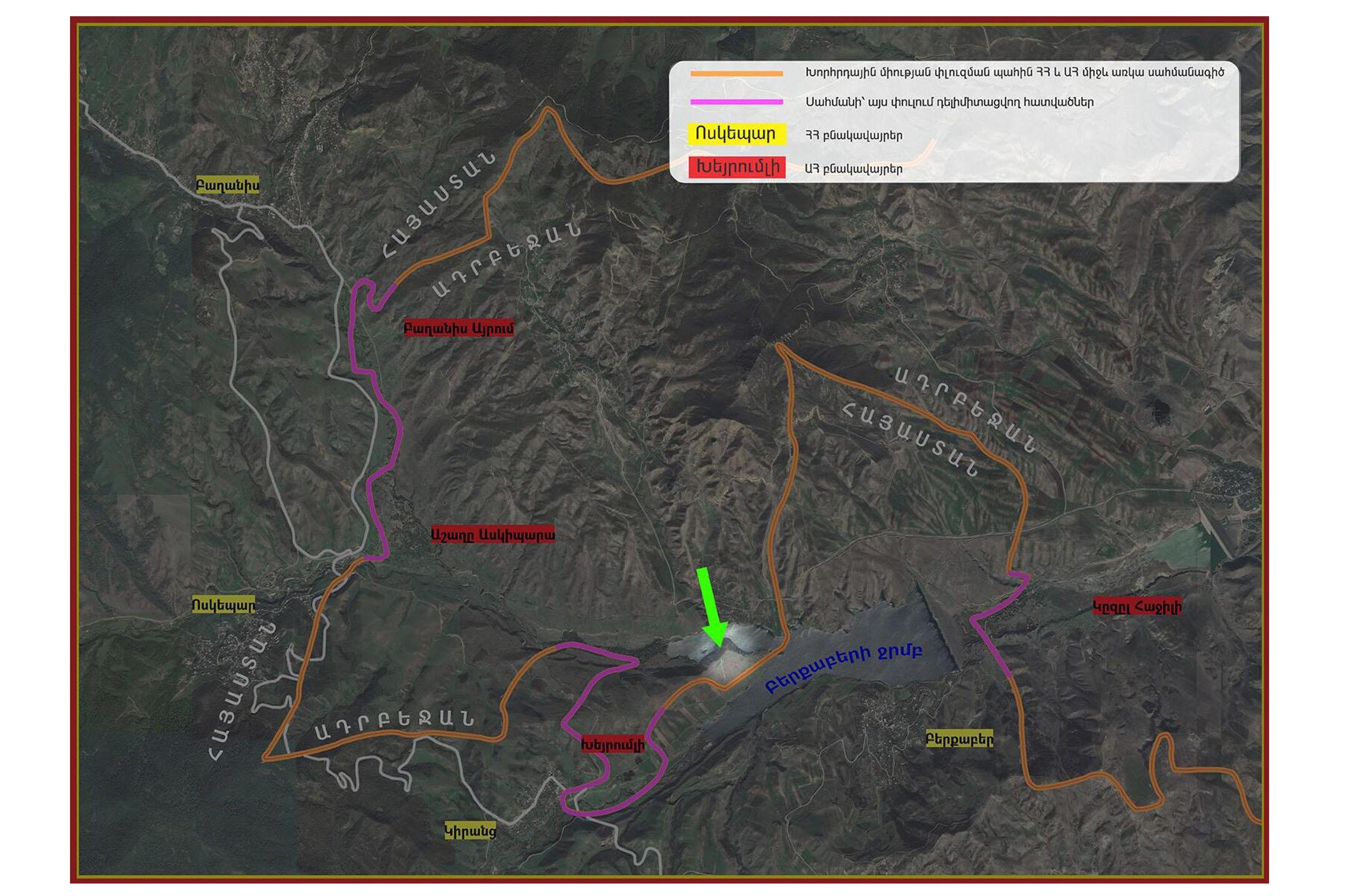 Позже аппарат премьер-министра Армении опубликовал карту, на которой розовым цветом указаны участки, подлежащие делимитации и демаркации.
