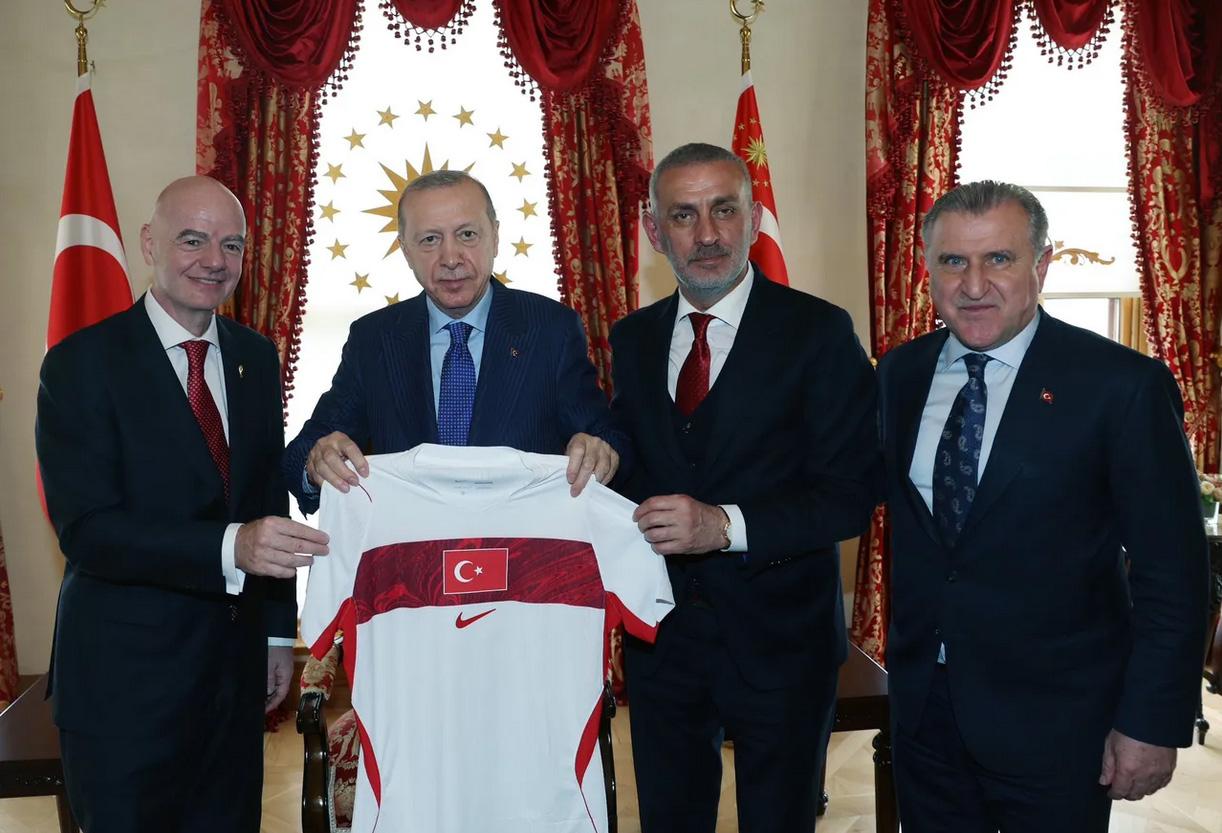 Глава ФИФА подарил турецкому лидеру именную футболку с номером 26 и надписью «Эрдоган», копию Кубка мира и официальный мяч чемпионата мира 2026 года.