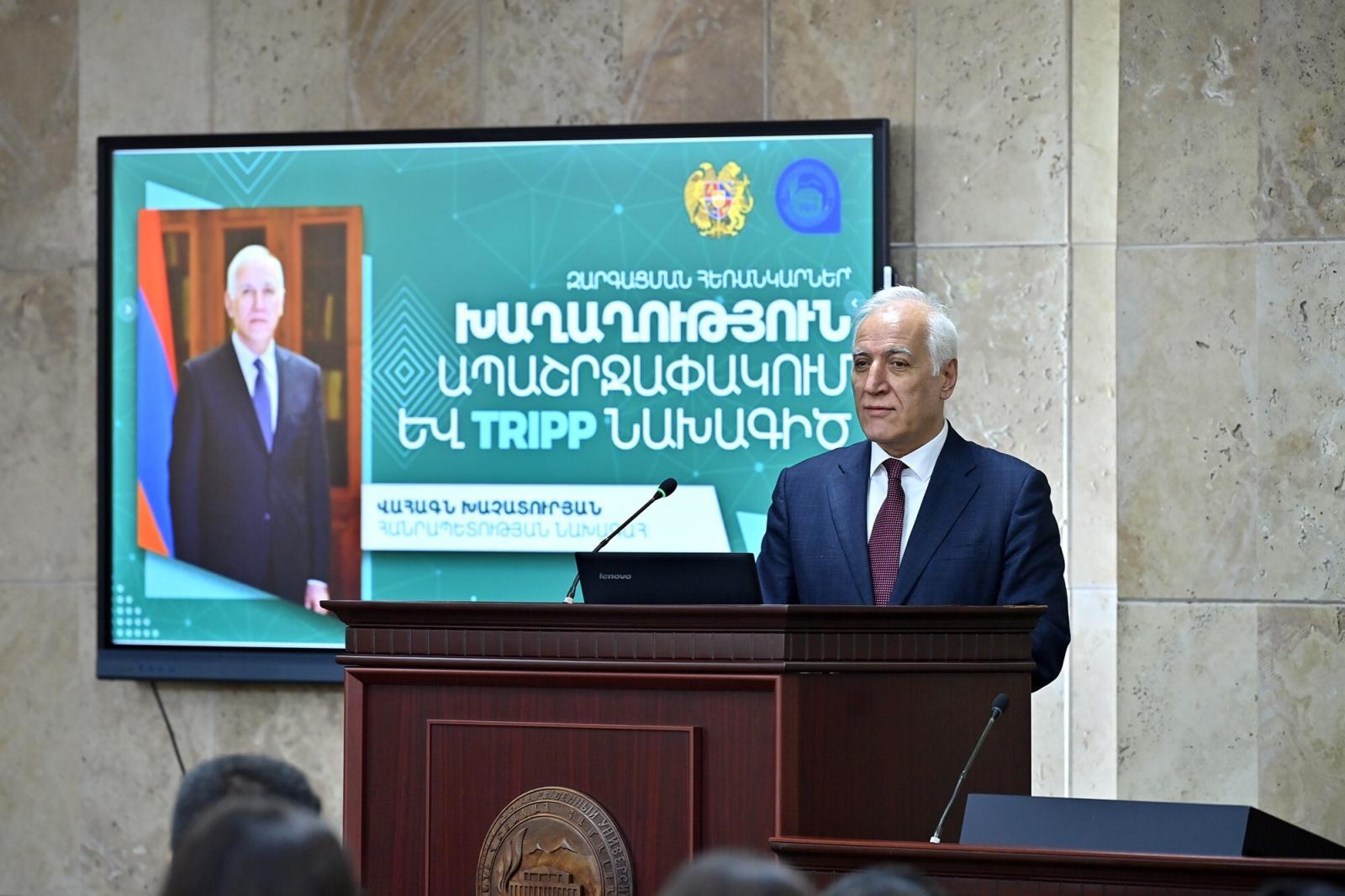 Президент Армении Ваагн Хачатурян посетил Ереванский государственный университет, где провел встречу со студентами и выступил с речью на тему «Перспективы развития, мир, деблокада и проект TRIPP».