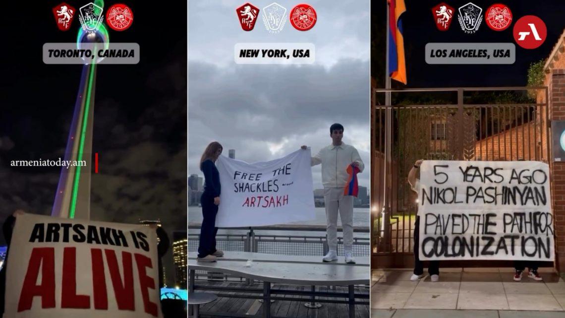 Протесты прошли в американских городах Лос-Анджелес, Вашингтон, Фресно, Сан-Франциско, Нью-Йорк и Провиденс, а также в канадских — Ванкувер, Монреаль, Кембридж и Торонто. В Лос-Анджелесе протест прошел у здания армянского консульства, где активисты разместили плакаты прямо на ограждении дипломатического представительства.