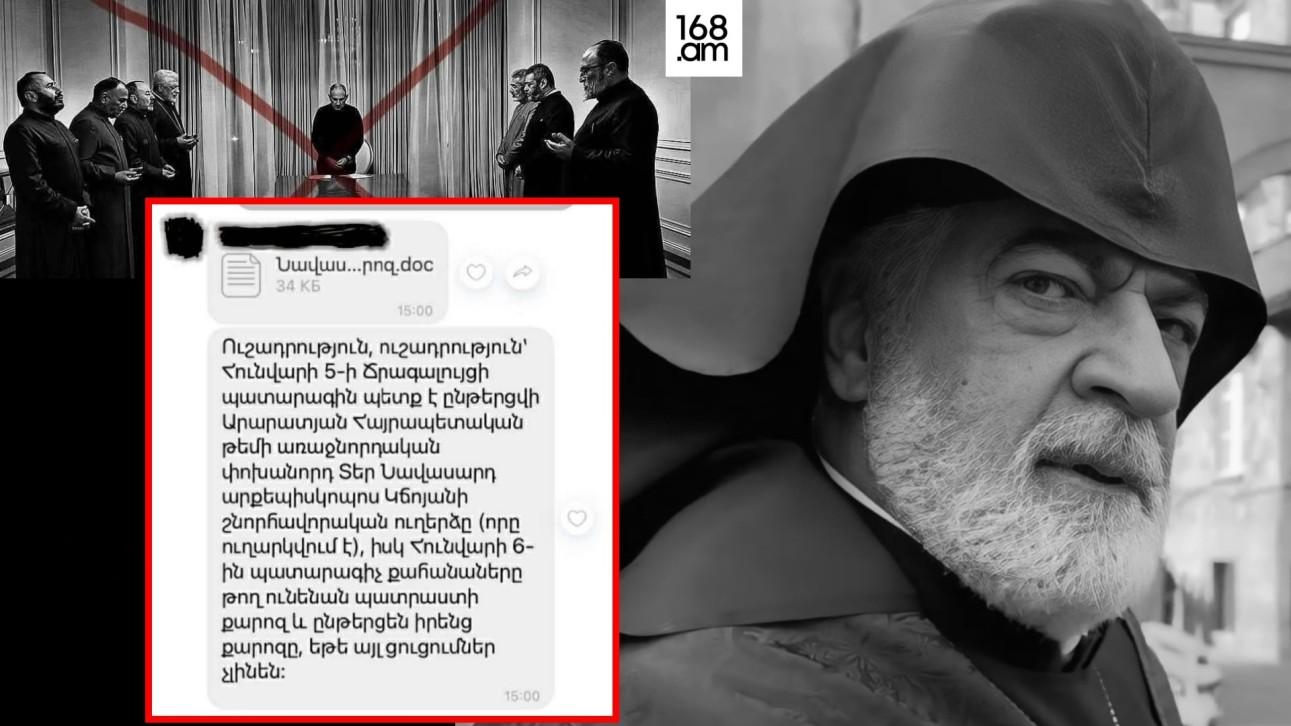 Сообщник Никола Пашиняна Навасард Кчоян в закрытой группе священников Араратской патриаршей епархии обязал всех священнослужителей своей епархии сегодня, во время церемонии зажжения рождественских лампад (Чрагалуйц) на Божественной литургии, зачитывать его личное послание-проповедь, а завтра, на главной Рождественской литургии, вместо традиционного Рождественского послания Католикоса всех армян зачитывать другие проповеди.