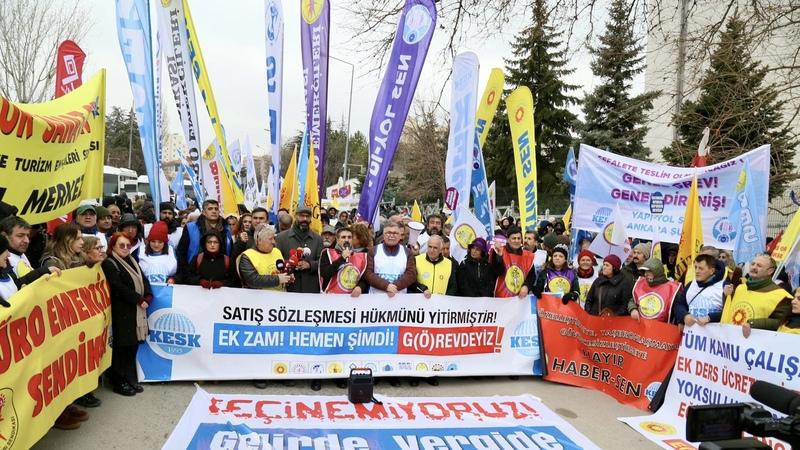 Около 800 сотрудников госсектора, представляющих Конфедерацию профсоюзов работников государственного сектора (KESK), направились к министерству труда в столице Турции, неся плакаты с требованием немедленного увеличения доходов.