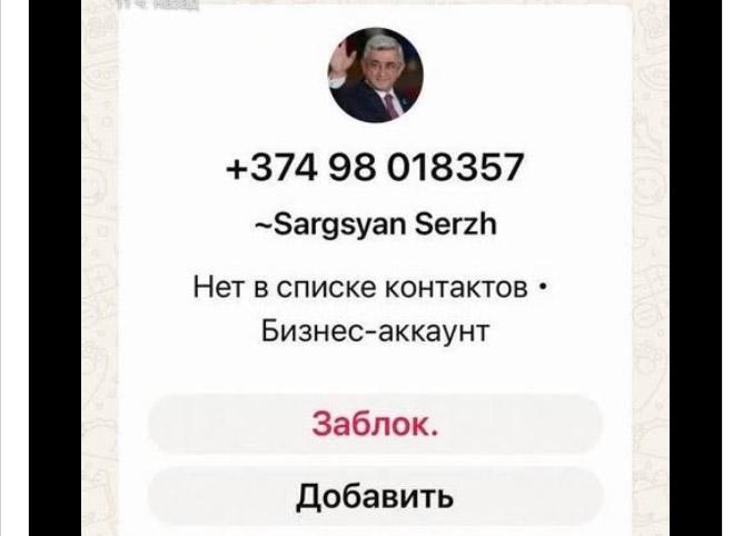 В приложении WhatsApp создан очередной фейковый аккаунт (+374 98018357) под именем третьего президента Армении Сержа Саргсяна, с которого отправляются сообщения разным людям.