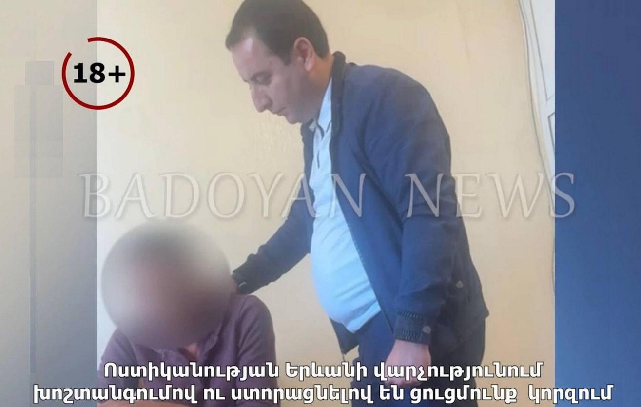 На видео, которое опубликовала журналист Сюзи Бадоян, предположительно, сотрудник полиции избивает допрашиваемого, используя нецензурную лексику. По ее сведениям, инцидент произошел в столичном управлении полиции, а на кадрах - оперуполномоченный Айк Акопян.