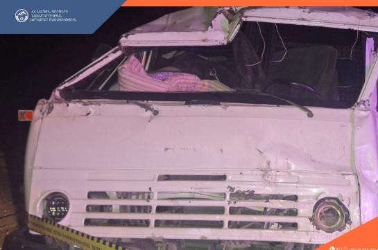 В результате столкновения КамАЗ перевернулся и оказался посреди дороги. В результате аварии в Араратский медицинский центр были доставлены 2 человека. Один пострадавший скончался, не приходя в сознание.