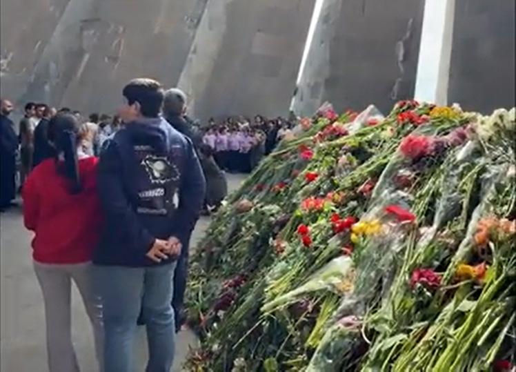 В мемориальном комплексе «Цицернакаберд» проходит традиционный сбор цветов, возложенных к Вечному огню в память о жертвах Геноцида армян.